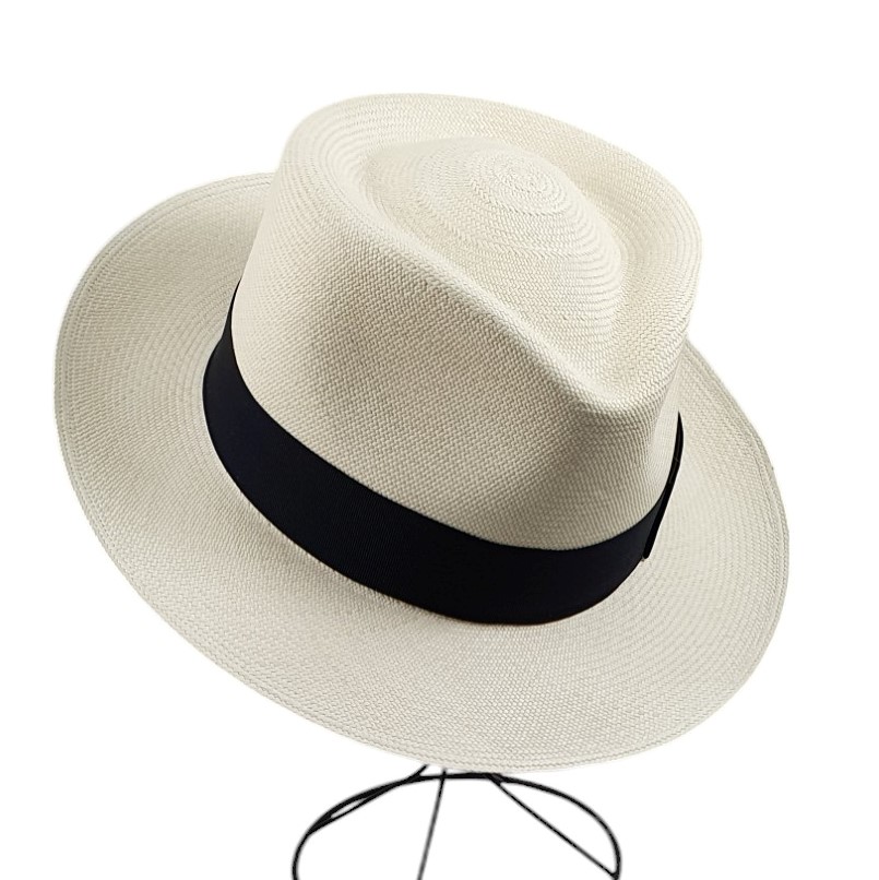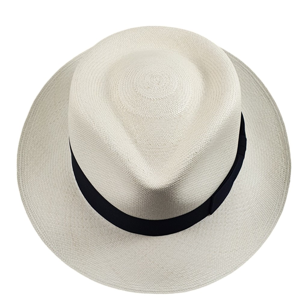 Zusätzlich für Liebhaber des weißen Panama-Huts: Diese Version ist eine Mischung aus weiß und naturfarbenem Montecristi Fino. Die Exklusivität und Einzigartigkeit dieses Hutes wird durch die besondere Schleife am Band betont, die sich deutlich von der Standardversion unterscheidet.